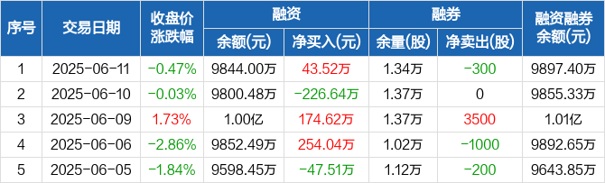 融资方面,当日融资买入315.38万元,融资偿还271.85万元,融资净买入43.52万元。融券方面,融券卖出100股,融券偿还400股,融券余量1.34万股,融券余额53.4万元。融资融券余额合计9897.4万元。