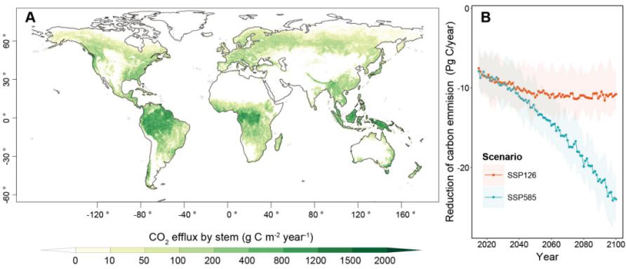 基于理论与观测的一致性,研究团队进一步评估了树干呼吸热适应对全球陆地生态系统碳通量的影响。结果显示,当前全球树干呼吸年碳排放量相当于人为排放的2~3倍。应用于SSP126和SSP585的未来气候变化情景分析,在考虑热适应的机制下,至2100年,树干呼吸预测值将分别降低24%和46%。