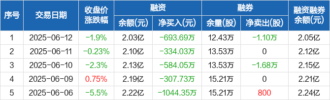 长城军工融资融券信息显示,2025年6月12日融资净偿还693.69万元;融资余额2.03亿元,较前一日下降3.31%。