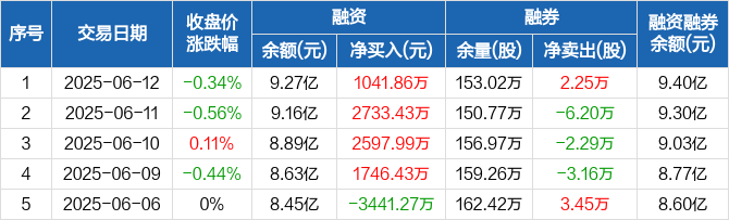 融资方面,当日融资买入5290.6万元,融资偿还4248.74万元,融资净买入1041.86万元,连续4日净买入累计8119.71万元。融券方面,融券卖出3.65万股,融券偿还1.4万股,融券余量153.02万股,融券余额1360.35万元。融资融券余额合计9.4亿元。