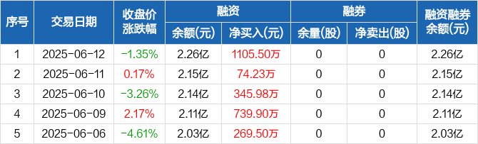巨力索具融资融券信息显示,2025年6月12日融资净买入1105.5万元;融资余额2.26亿元,较前一日增加5.14%。