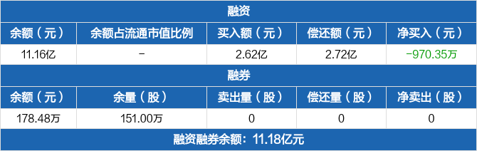 融资方面,当日融资买入2.62亿元,融资偿还2.72亿元,融资净偿还970.35万元。融券方面,融券卖出0份,融券偿还0份,融券余量151万份,融券余额178.48万元。融资融券余额合计11.18亿元。