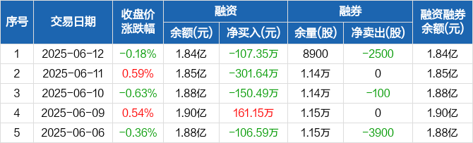 融资方面,当日融资买入447.8万元,融资偿还555.15万元,融资净偿还107.35万元,连续3日净偿还累计559.48万元。融券方面,融券卖出0股,融券偿还2500股,融券余量8900股,融券余额19.8万元。融资融券余额合计1.84亿元。