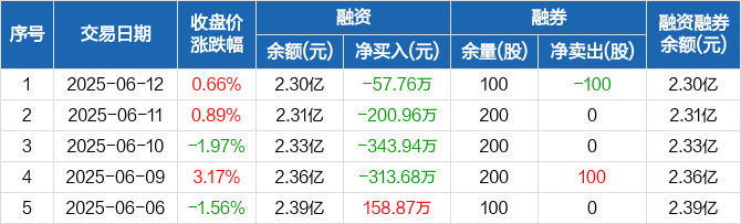 融资方面,当日融资买入556.01万元,融资偿还613.76万元,融资净偿还57.76万元,连续4日净偿还累计916.33万元。融券方面,融券卖出0股,融券偿还100股,融券余量100股,融券余额1363元。融资融券余额合计2.3亿元。