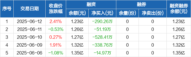 融资方面,当日融资买入788.81万元,融资偿还1079.07万元,融资净偿还290.26万元,连续7日净偿还累计1666.96万元。融券方面,融券卖出0份,融券偿还0份,融券余量0份,融券余额0元。融资融券余额合计1.23亿元。