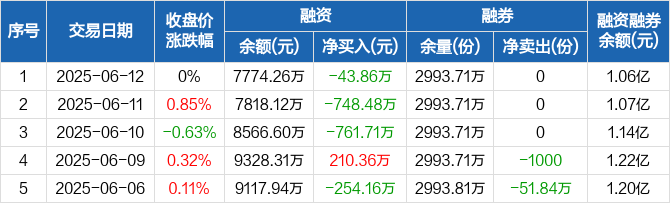 融资方面,当日融资买入1078.71万元,融资偿还1122.58万元,融资净偿还43.86万元,连续3日净偿还累计1554.05万元。融券方面,融券卖出0份,融券偿还0份,融券余量2993.71万份,融券余额2847.02万元。融资融券余额合计1.06亿元。