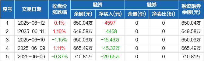 融资方面,当日融资买入43.74万元,融资偿还43.28万元,融资净买入4597元。融券方面,融券卖出0份,融券偿还0份,融券余量0份,融券余额0元。融资融券余额合计650.04万元。