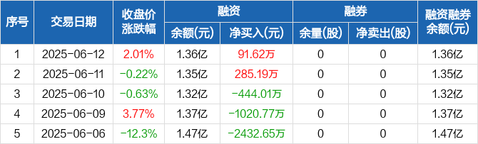 恒而达融资融券信息显示,2025年6月12日融资净买入91.62万元;融资余额1.36亿元,较前一日增加0.68%。