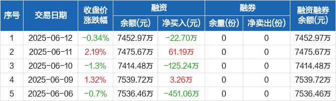 融资方面,当日融资买入545.03万元,融资偿还567.74万元,融资净偿还22.7万元。融券方面,融券卖出0份,融券偿还0份,融券余量0份,融券余额0元。融资融券余额合计7452.97万元。