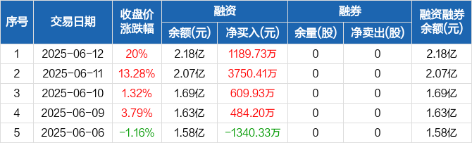融资方面,当日融资买入1.82亿元,融资偿还1.7亿元,融资净买入1189.73万元,连续4日净买入累计6034.28万元。融券方面,融券卖出0股,融券偿还0股,融券余量0股,融券余额0元。融资融券余额合计2.18亿元。