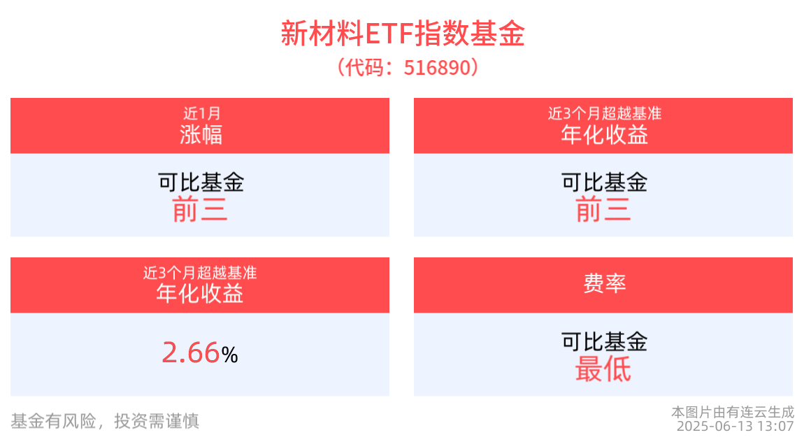 新材料ETF指数基金紧密跟踪中证新材料主题指数,中证新材料主题指数选取50只业务涉及先进钢铁、有色金属、化工、无机非金属等基础材料以及关键战略材料等新材料领域的上市公司证券作为指数样本,以反映新材料主题上市公司证券的整体表现。