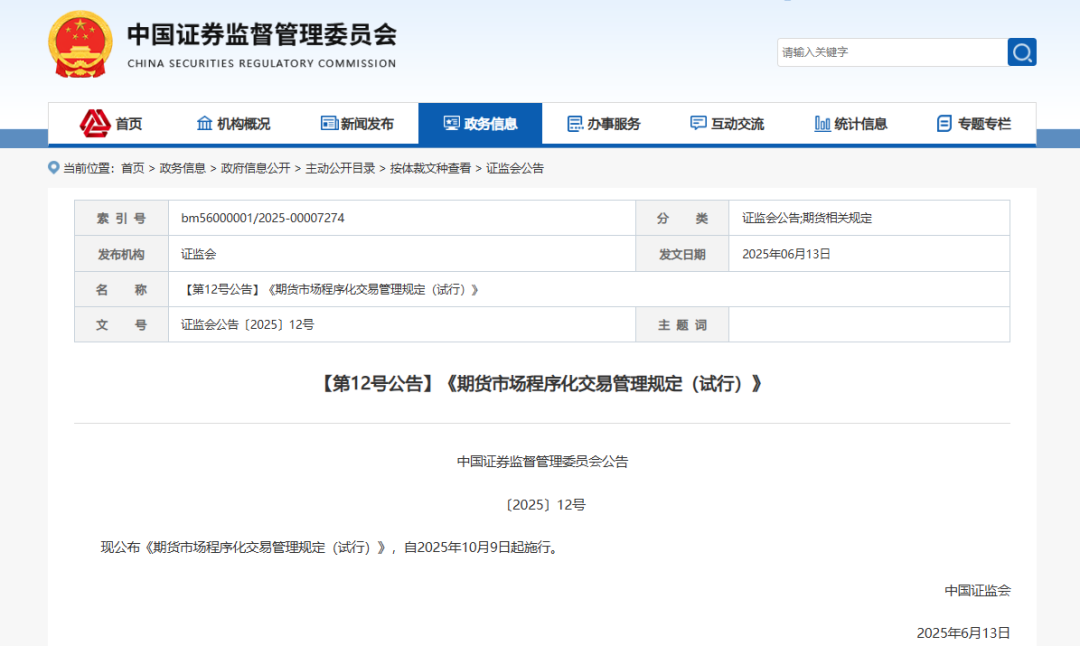 6月13日,中国证监会公布《期货市场程序化交易管理规定(试行)》(以下简称《管理规定》),自2025年10月9日起施行。
