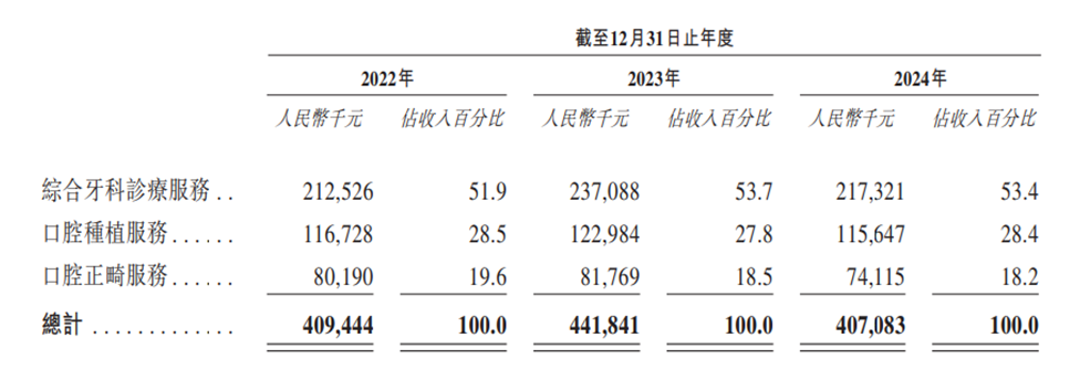 作为大众口腔收入贡献超50%的综合牙科诊疗服务,2024年收入为2.17亿元,同比下滑8.34%;其次,占比近30%的口腔种植服务收入为1.16亿元,同比下滑了5.97%;最后是口腔正畸服务,收入也由2023年的8176.9万元下滑至2024年的7411.5万元。