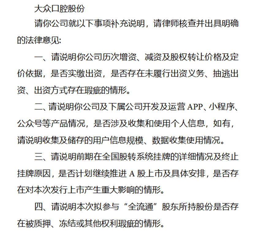 2025年2月14日,中国证券监督管理委员会发布的《境外发行上市备案补充材料要求公示(2025年2月7日 - 2025年2月13日)》显示,大众口腔需要就多个事项进行补充说明,包括股权变动历史沿革、信息收集和使用、新三板挂牌问题及后续计划以及是否存在股权瑕疵等问题。