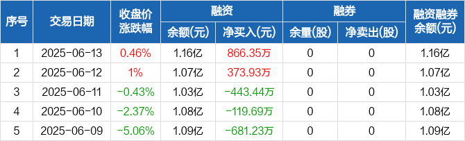 融资方面,当日融资买入1460.86万元,融资偿还594.52万元,融资净买入866.35万元。融券方面,融券卖出0股,融券偿还0股,融券余量0股,融券余额0元。融资融券余额合计1.16亿元。
