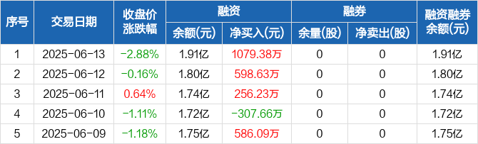 融资方面,当日融资买入2476.03万元,融资偿还1396.64万元,融资净买入1079.38万元,连续3日净买入累计1934.24万元。融券方面,融券卖出0股,融券偿还0股,融券余量0股,融券余额0元。融资融券余额合计1.91亿元。