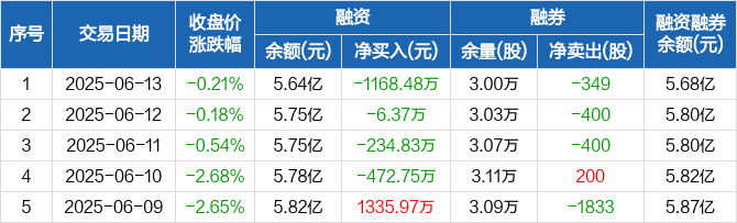 融资方面,当日融资买入1891.54万元,融资偿还3060.02万元,融资净偿还1168.48万元,连续4日净偿还累计1882.43万元。融券方面,融券卖出600股,融券偿还949股,融券余量3万股,融券余额432.18万元。融资融券余额合计5.68亿元。