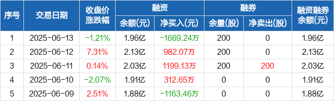 融资方面,当日融资买入3463.34万元,融资偿还5132.58万元,融资净偿还1669.24万元。融券方面,融券卖出0股,融券偿还0股,融券余量200股,融券余额4410元。融资融券余额合计1.96亿元。