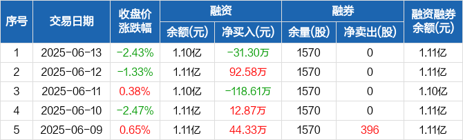 融资方面,当日融资买入160.3万元,融资偿还191.61万元,融资净偿还31.3万元。融券方面,融券卖出0股,融券偿还0股,融券余量1570股,融券余额4.79万元。融资融券余额合计1.11亿元。