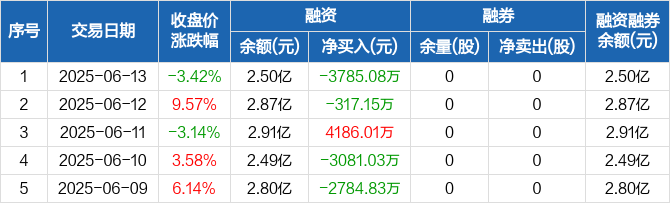 融资方面,当日融资买入3787.81万元,融资偿还7572.89万元,融资净偿还3785.08万元。融券方面,融券卖出0股,融券偿还0股,融券余量0股,融券余额0元。融资融券余额合计2.5亿元。