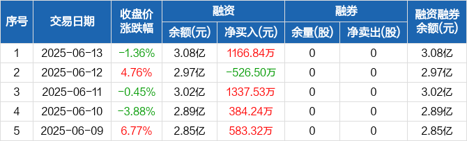 融资方面,当日融资买入3139.6万元,融资偿还1972.76万元,融资净买入1166.84万元。融券方面,融券卖出0股,融券偿还0股,融券余量0股,融券余额0元。融资融券余额合计3.08亿元。