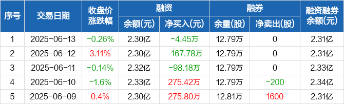融资方面,当日融资买入2713.26万元,融资偿还2717.71万元,融资净偿还4.45万元,连续3日净偿还累计270.4万元。融券方面,融券卖出0股,融券偿还0股,融券余量12.79万股,融券余额97.17万元。融资融券余额合计2.31亿元。
