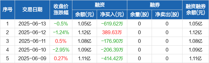艾森股份融资融券信息显示,2025年6月13日融资净偿还619.62万元;融资余额1.05亿元,较前一日下降5.56%。