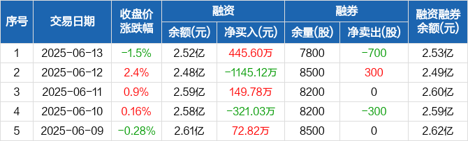融资方面,当日融资买入1520.4万元,融资偿还1074.8万元,融资净买入445.6万元。融券方面,融券卖出0股,融券偿还700股,融券余量7800股,融券余额70.04万元。融资融券余额合计2.53亿元。