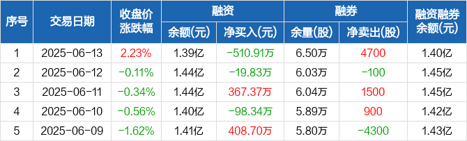 九丰能源融资融券信息显示,2025年6月13日融资净偿还510.91万元;融资余额1.39亿元,较前一日下降3.56%。