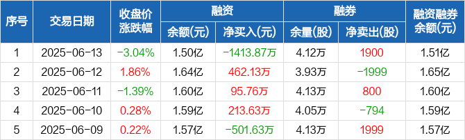 融资方面,当日融资买入1405.53万元,融资偿还2819.41万元,融资净偿还1413.87万元。融券方面,融券卖出1900股,融券偿还0股,融券余量4.12万股,融券余额72.15万元。融资融券余额合计1.51亿元。