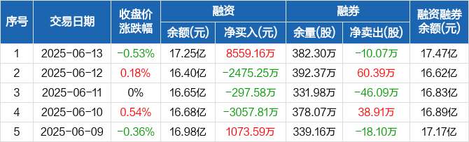 农业银行融资融券信息显示,2025年6月13日融资净买入8559.16万元;融资余额17.25亿元,较前一日增加5.22%。