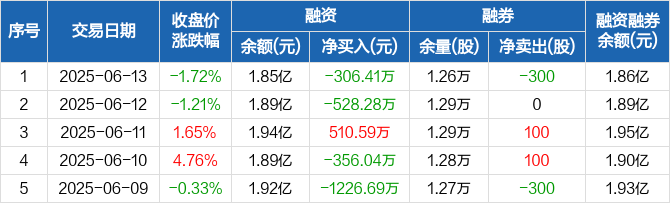 融资方面,当日融资买入3619.8万元,融资偿还3926.21万元,融资净偿还306.41万元。融券方面,融券卖出0股,融券偿还300股,融券余量1.26万股,融券余额82.97万元。融资融券余额合计1.86亿元。