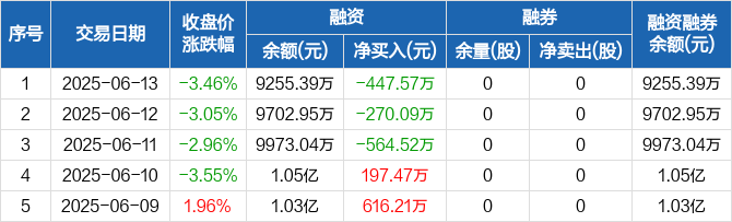 融资方面,当日融资买入258.93万元,融资偿还706.49万元,融资净偿还447.57万元,连续3日净偿还累计1282.18万元。融券方面,融券卖出0股,融券偿还0股,融券余量0股,融券余额0元。融资融券余额合计9255.39万元。