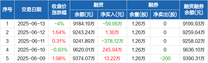 融资方面,当日融资买入610.68万元,融资偿还669.73万元,融资净偿还59.06万元。融券方面,融券卖出0股,融券偿还0股,融券余量1.26万股,融券余额15.75万元。融资融券余额合计9199.93万元。