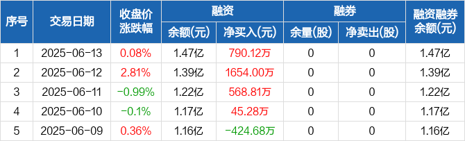 安邦护卫融资融券信息显示,2025年6月13日融资净买入790.12万元;融资余额1.47亿元,创近一年新高,较前一日增加5.68%。