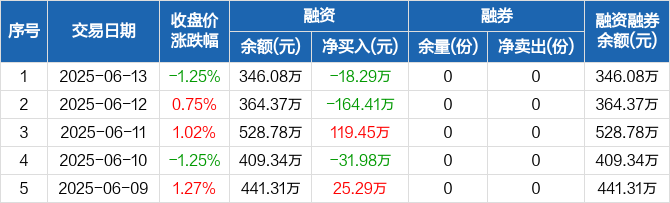 融资方面,当日融资买入348.97万元,融资偿还367.26万元,融资净偿还18.29万元。融券方面,融券卖出0份,融券偿还0份,融券余量0份,融券余额0元。融资融券余额合计346.08万元。