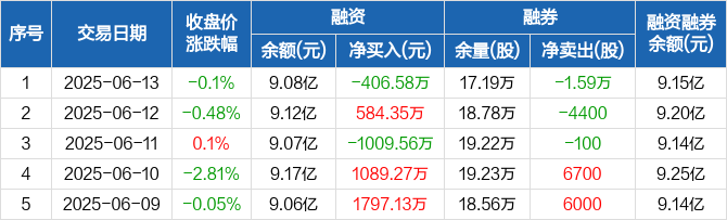 融资方面,当日融资买入3879.75万元,融资偿还4286.33万元,融资净偿还406.58万元。融券方面,融券卖出5400股,融券偿还2.13万股,融券余量17.19万股,融券余额705.31万元。融资融券余额合计9.15亿元。