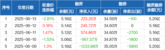 融资方面,当日融资买入3662.27万元,融资偿还3439.01万元,融资净买入223.26万元,连续3日净买入累计1043.84万元。融券方面,融券卖出0股,融券偿还100股,融券余量34.59万股,融券余额418.88万元。融资融券余额合计5.2亿元。