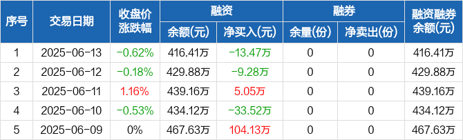 融资方面,当日融资买入63.19万元,融资偿还76.66万元,融资净偿还13.47万元。融券方面,融券卖出0份,融券偿还0份,融券余量0份,融券余额0元。融资融券余额合计416.41万元。