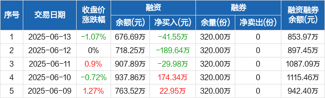 融资方面,当日融资买入147.62万元,融资偿还189.17万元,融资净偿还41.55万元,连续3日净偿还累计261.17万元。融券方面,融券卖出0份,融券偿还0份,融券余量320万份,融券余额177.28万元。融资融券余额合计853.97万元。