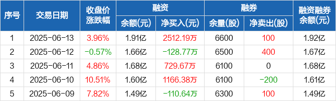 融资方面,当日融资买入4236.82万元,融资偿还1724.62万元,融资净买入2512.19万元,净买入额创历史新高。融券方面,融券卖出100股,融券偿还0股,融券余量6600股,融券余额64.75万元。融资融券余额合计1.92亿元。