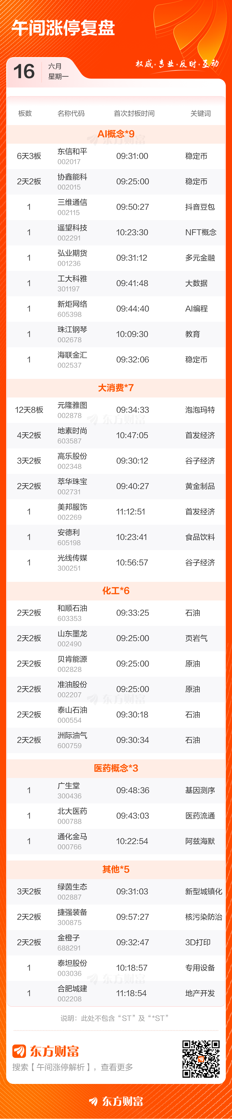 6月16日午间涨停复盘:49股涨停 东信和平6天3板