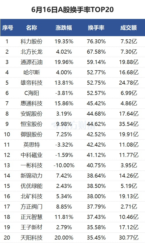 当天换手率最高的个股为科力股份,全天换手率76.3%。北方长龙紧随其后,全天换手率67.58%。