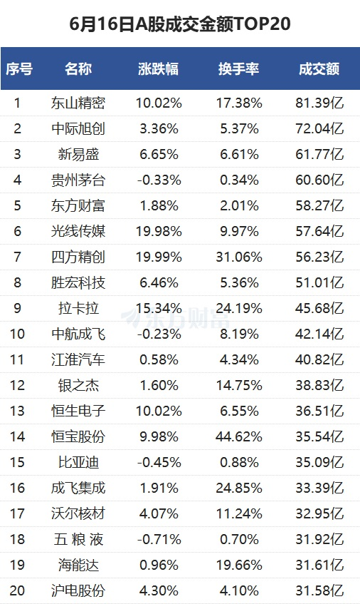 沪深两市成交额1.22万亿元,较上一交易日缩量2521.57亿元。个股方面,东山精密当日成交81.39亿元。中际旭创当日成交72.04亿元。