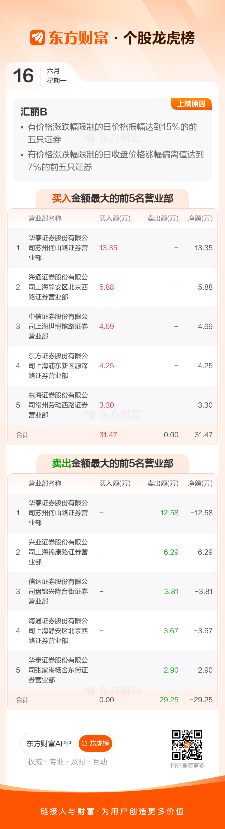 交易所2025年6月16日公布的交易公开信息显示,汇丽B因成为有价格涨跌幅限制的日价格振幅达到15%的前五只证券、有价格涨跌幅限制的日收盘价格涨幅偏离值达到7%的前五只证券上榜。汇丽B当日收报0.415元,涨跌幅10.08%,偏离值15.28%,换手率2.84%,成交额100.47万。