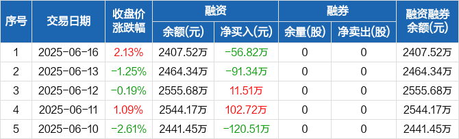 融资方面,当日融资买入61.44万元,融资偿还118.26万元,融资净偿还56.82万元。融券方面,融券卖出0股,融券偿还0股,融券余量0股,融券余额0元。融资融券余额合计2407.52万元。