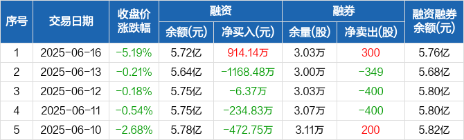 融资方面,当日融资买入3887.84万元,融资偿还2973.7万元,融资净买入914.14万元。融券方面,融券卖出900股,融券偿还600股,融券余量3.03万股,融券余额413.85万元。融资融券余额合计5.76亿元。