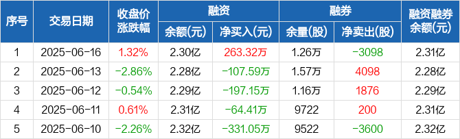 融资方面,当日融资买入452.13万元,融资偿还188.82万元,融资净买入263.32万元。融券方面,融券卖出400股,融券偿还3498股,融券余量1.26万股,融券余额20.38万元。融资融券余额合计2.31亿元。