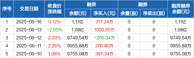 融资方面,当日融资买入1017.86万元,融资偿还700.63万元,融资净买入317.24万元。融券方面,融券卖出0股,融券偿还0股,融券余量0股,融券余额0元。融资融券余额合计1.11亿元。