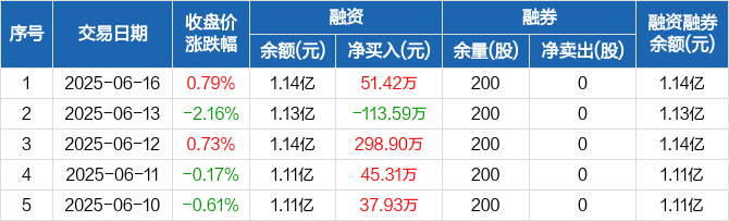 融资方面,当日融资买入183.96万元,融资偿还132.54万元,融资净买入51.42万元。融券方面,融券卖出0股,融券偿还0股,融券余量200股,融券余额3560元。融资融券余额合计1.14亿元。